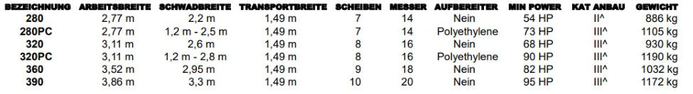Langleb ige Q+-Scheiben mit Schnel lwechselklingen Zentra le Rotat ion der Förde rscheib e Spira lförmig e Messer Gegenschnei den Umkehrbare Scheibenk lingen Vol lständig abgedeckte K u fen Einstellbare Arbe itshöhe mit Feder bis zu 40 mm, Anpassung des Schnittwinkels um 3° Horizonta le oder v ertika le h intere Transportposition mit automatischem Ak ti vierungssicherheitssystem Feste Hubarme , die die Zapfwelle in Lin ie halten Erforderl iche Steuerge räte:2 Einze lwirken d, 1 D oppe lwirke nd VERSION PC Y-förmiger Zinkenaufbere iter aus Polyethylen „Easy-Dry“-System: Mit e inem einzigen Hebel können Sie d ie Streubreite e instellen